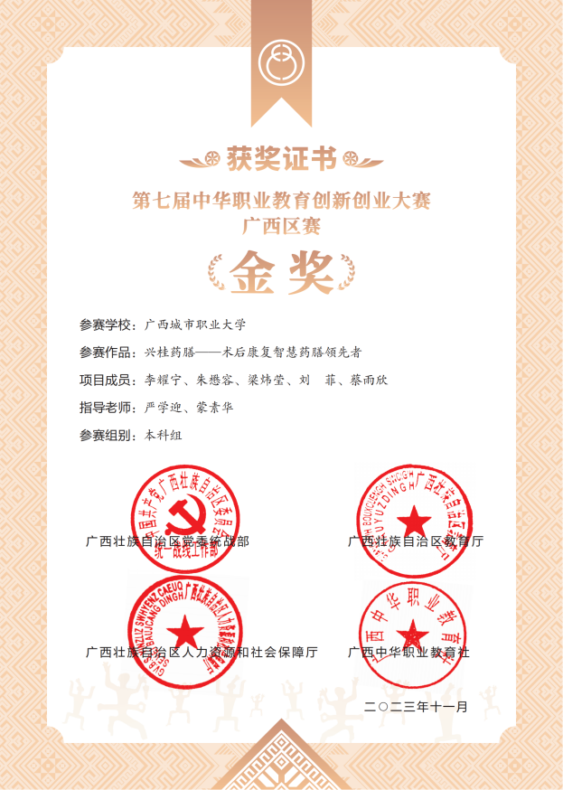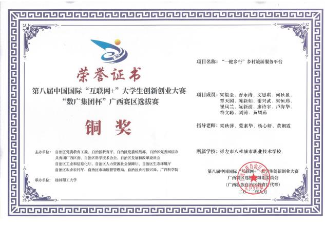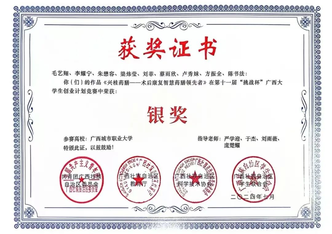 15.2024年7月在第11届“挑战杯”广西大学生创业计划竞赛中荣获团体奖银奖。