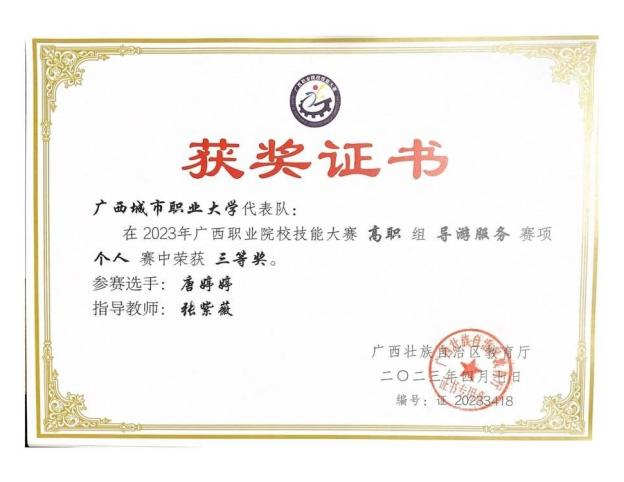 1.学生参加历届广西职业院校技能大赛高职组导游服务赛项,累计获得二等奖1项,三等奖12项。